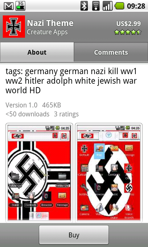 Steve Jobs zei ooit, mensen die van porno houden moeten geen iPhone maar een Android kopen, suggererend dat alles kan en mag op Google’s Android Market. Vanmorgen werden wij getipt dat de market ook vol zit met hatelijke content.