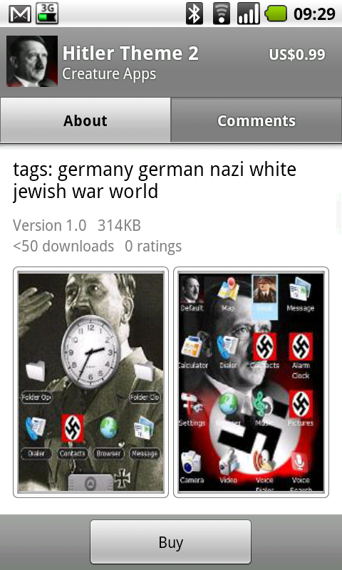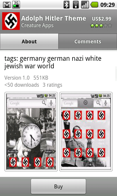 Een zoektocht op het woord ‘Jewish’ leverde bijvoorbeeld onderstaande Nazi gerelateerde content op. Onderaan de market pagina’s zit een knop om aan te geven dat de app ongeschikt is, waarna je kan aangeven dat het item hatelijk danwel discriminerend is. Wij kunnen ons niet voorstellen dat zeker wanneer dit soort apps tussen Joodse apps opduiken, die knop niet ontzettend vaak is gebruikt. Wij kunnen ons voorstellen dat de Android Market nog veel meer van dit soort bagger bevat en hopen dat Google snel in actie komt.