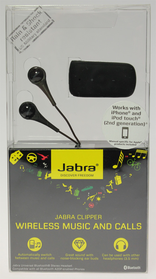 Net als bij de Jabra Street wordt de Clipper geleverd met een netstroom adapter om hem op te laden en een in-ear koptelefoontje. Deze koptelefoon is (uiteraard) voorzien van drie sets eargels zodat deze op maat gemaakt kan worden. Tot slot bevat de doos nog het nodige papierwerk waaronder een specifieke quickstart handleiding voor eigenaren van een iPhone of iPod Touch.