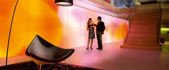 De geluiddempende panelen van Kvadrat zijn voor veel kantoren en andere gelegenheden van groot belang om echo’s in kale ruimten te vermijden. Met behulp van de Philips LED’s kunnen ze nu ook gebruikt worden om de sfeer in een ruimte te bepalen.