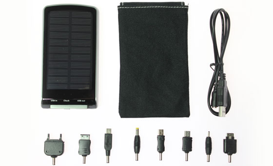 Zoals we inmiddels van A-Solar gewend zijn, bevat de verpakking van de Platinum Charger niet alleen de lader zelf, maar ook een uitgebreid assortiment aan pluggen om je gadgets mee op te laden. Om de lader mooi te houden, levert A-Solar er ook meteen een beschermzakje mee.