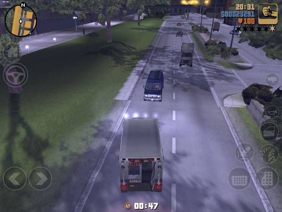 Hoewel de gameplay origineel is gebleven, heeft Rockstar voor GTA III wel aan de controls moeten werken. We gaan immers van controller naar on-screen knoppen. Dit heeft Rockstar best goed op weten te lossen, al zou het fijn zijn geweest als Rockstar ondersteuning bood voor iPad joysticks zoals die van Targus en Logitech. Dit omdat je auto’s niet met een analoge stick bestuurt, maar met een links-rechts knop terwijl de analoge stick wel voor lopen wordt toegepast. Ook sturen auto’s hierdoor net iets minder precies. Jammer.