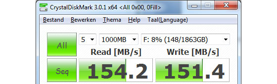 Toch kon ik het niet laten om even een kleine test te doen. Ik heb de USB 3.0 hub aangesloten met daaraan de Sandberg Alugear USB 3.0 HDD case met daarin zit een WD Caviar Black WD2002FAEX HDD van Western Digital. Tijdens onze test op een USB 3.0 aansluiting die direct op het Asus Crosshair IV moederbord zit behaalden we een gemiddelde datasnelheid van 155MB/s schrijven en 152.5MB/s lezen. De snelheid is in beide gevallen met ongeveer 1MB/s afgenomen. Wat mij betreft verwaarloosbaar. Testen met USB 3.0 sticks laten een vergelijkbaar resultaat zien.