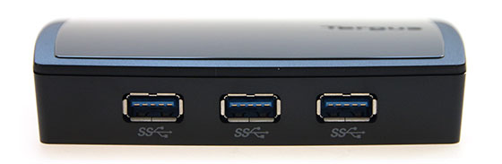 Aan de ene lange zijde heeft Targus keurig drie USB 3.0 poorten op de Targus 7-Port USB 3.0 Superspeed Combo Hub geplaatst. De afstand tussen de drie is groot genoeg om zelfs de bredere USB 3.0 sticks van LaCie op te kunnen plaatsen.
