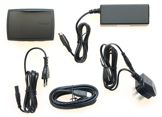 In de blister van deze hub vinden we naast de hub zelf een berg aan bekabeling. De hub heeft namelijk een sterke transformator nodig om alle 7 poorten van de juiste hoeveelheden stroom te voorzien. De hub wordt zowel in Europa als in het Verenigd Koninkrijk met dezelfde verpakking verkocht. Dat zien we terug in de twee netsnoeren die Targus voor deze markten in de verpakking heeft gestopt. Ten slotte zit er nog een USB 3.0 kabel in om de computer en de hub met elkaar te verbinden.