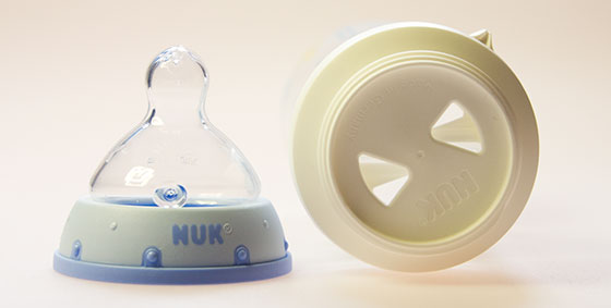 De echte innovatie zit hem echter in de sluiting van de flessen. Standaard zit bij iedere fles een plastic schot dat je tussen de fles en de speen kunt vastdraaien. Om deze weg te halen, moet je de twee eerst weel losdraaien. Nuk weet dat dit onhandig is en heeft daarom ook een draaimechanisme ontwikkeld dat tussen de fles en de speen kan worden gezet. Om de fles te openen hoef je de twee maar een kwart slag te draaien. Slim!