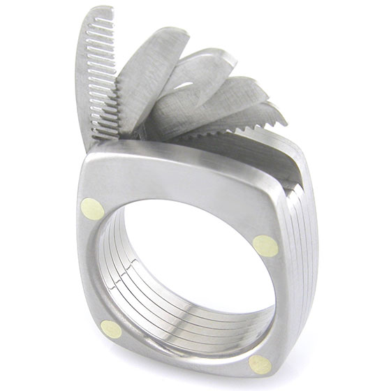 De Man Ring bevat een flessenopener, een klein mes, een zaagje voor harder materiaal en een kam… voor jouw wenkbrauwen…