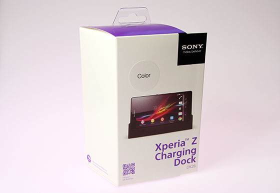 De Xperia Z Charging Dock zit in een vrolijke, wit-paarse verpakking. De stikker op de doos verraad welke kleur dock er in zit.