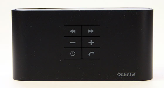 Bediening van de Leitz Complete gebeurt via het knoppenpaneel op de bovenkant van de speaker. Hier kun je tracks skippen en het volume aanpassen. Daarnaast is het ook mogelijk om gesprekken op te nemen. De Leitz Complete werkt dan als een speakerphone. De kwaliteit van de microfoon in de Complete is prima, maar niet bijzonder. De grote blauwe knop aan de voorkant blijkt geen knop te zijn. Gewoon een stukje versiering.