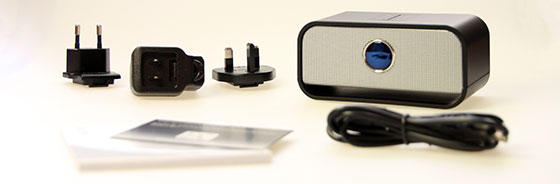 De uitrusting is wel heel volledig. Je krijgt een USB netstroomlader met een adaptertje voor de EU en het VK. Daarnaast zit er een mini-USB snoer in. Inderdaad, de speaker maakt geen gebruik van de Micro-USB standaard die we op non-iOS gadgets tegenkomen. Tenslotte zit er nog een kleine handleiding in.