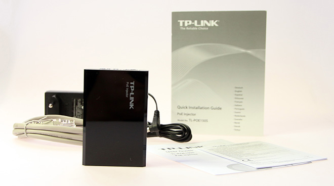 De verpakking van de TL-POE150S bevat de PoE Injector, een netstroom adapter, een kleine netwerkkabel en wat overbodige documentatie.