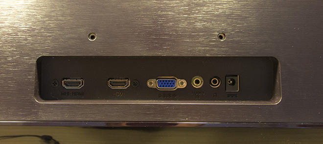 Op de achterkant van het display vinden we een VGA input met begeleidende 3.5mm jack ingang. De 284E5QHAD monitor bevat immers speakers. Daarnaast zijn er twee HDMI ingangen waarvan de tweede ook MHL ondersteuning biedt. Die MHL ondersteuning houdt in dan het scherm van jouw toestel niet alleen gemirrord wordt op de 284E5QHAD, maar dat de monitor de smartphone of tablet van stroom voorziet zodat deze niet meteen leeg is. Handig!
