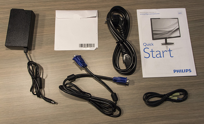 Met een driver CD, een VGA kabel, een netstroom adapter met netstroom kabel en een 3.5mm audiokabel bevat de verpakking van de 284E5QHAD alles dat je in een monitordoos mag verwachten. Een MHL kabel ontbreekt helaas. Dat zou de set mooi compleet hebben gemaakt.