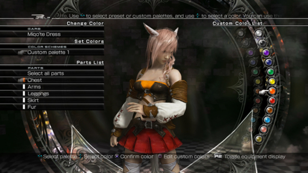 Je kan Lightning niet enkel nieuwe gear en wapens aanmeten maar je kan haar ook volledig aanpassen wat betreft kleuren en kapsel. Zo is elk onderdeel van de gear te ‘verfen’ is de kleuren die jij het beste vindt staan, of als je alle sets bijvoorbeeld wilt matchen. Ik vind het persoonlijk niet zo’n meerwaarde, ik kan me er echter wel in vinden dat anderen dit een geweldige feature vinden.
