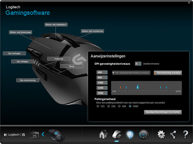 Standaard zijn de knoppen rechtsvoor gebruikt voor het schakelen tussen de verschillende DPI waarden van de sensoren in de G402 Hyperion Fury. Drie status-LED’s tussen de knoppen geven nauwkeurig aan hoe de gevoelig de muis is. Je bent natuurlijk vrij dit zelf aan te passen.