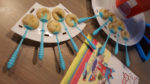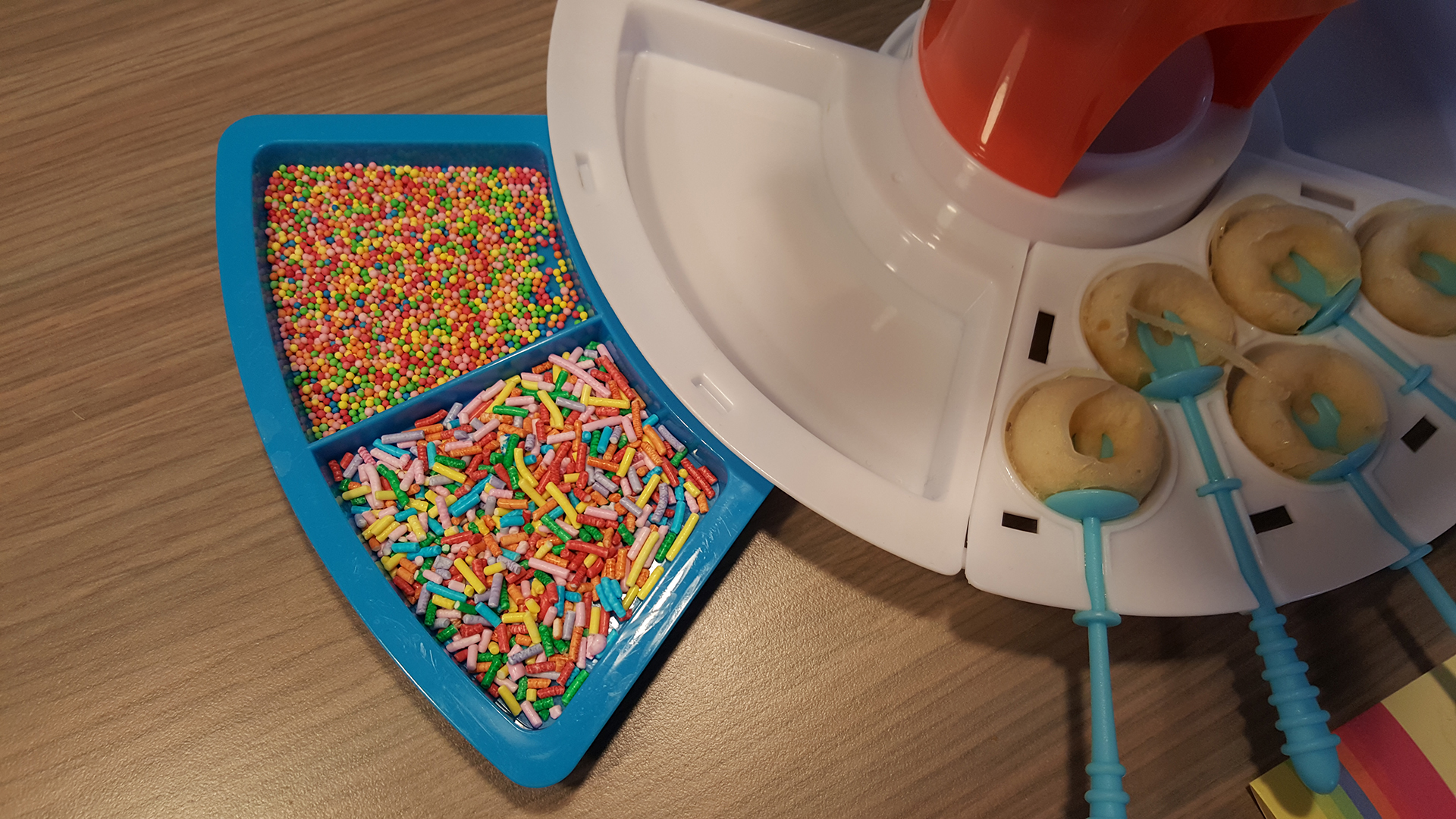 Wat verder opvalt is dat de blauwe bakjes net niet goed op te witte passen. Het idee is dat ze aan elkaar klikken, maar de blauwe zijn te ondiep. In de praktijk leg je ze dus los neer. Net als de houders met de lollies trouwens. Doordat de stokjes losklikken komen de hele bakjes los te liggen.