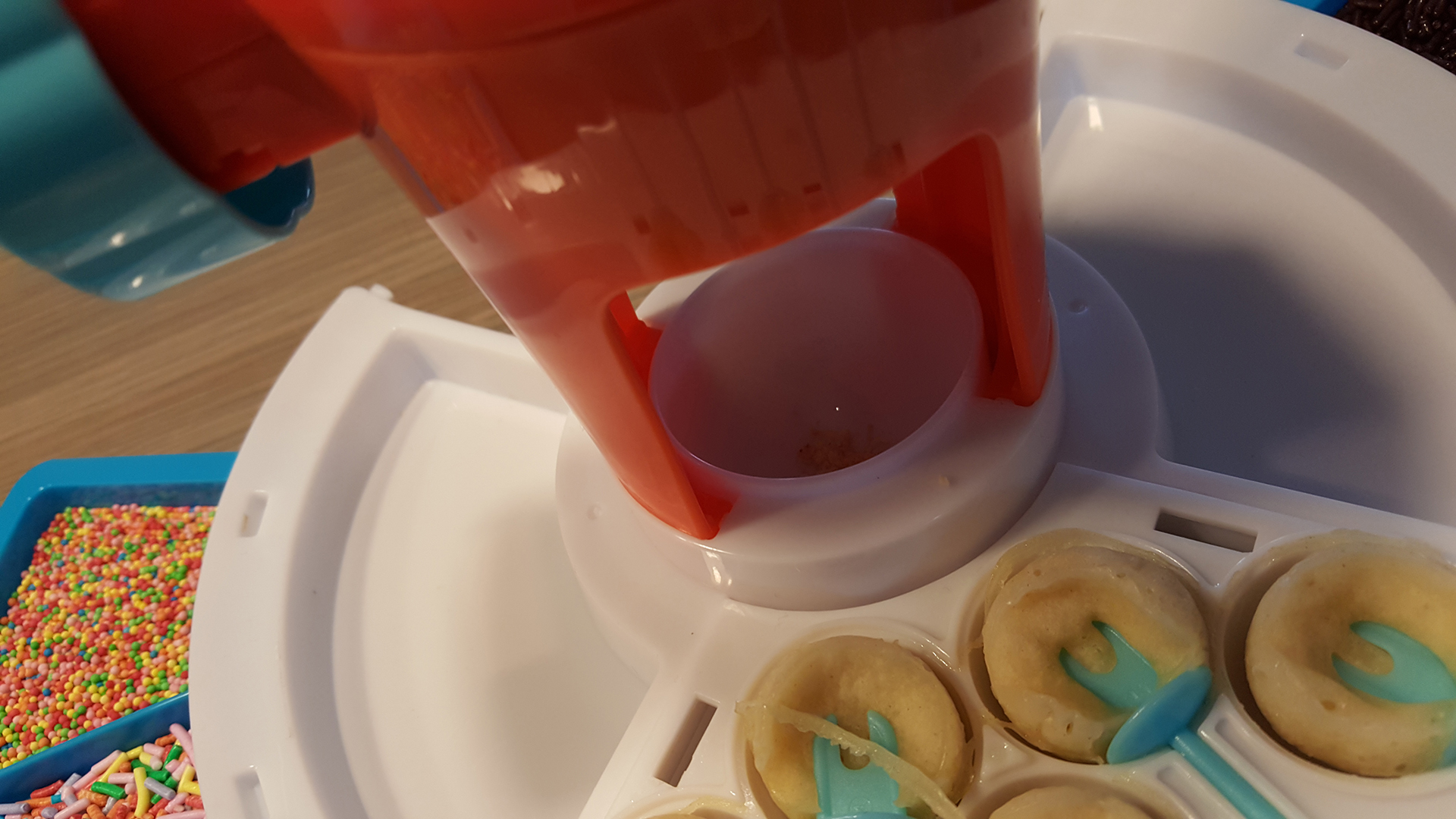 De handleiding biedt veel ondersteuning met foto’s en korte teksten. Het recept om de cakepops te maken is op basis van pannenkoekenbeslag. Jammer dat de handleiding gebruik maakt van een verhouding in ml en cups. De cup is tussen Amerika en Engeland zeer variabel, dus is het gokken hoe dik het beslag moet zijn. Ik kan je vertellen, vrij dik. Via een injectiespuit is het beslag gemakkelijk in de vormpjes te spuiten.