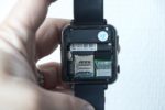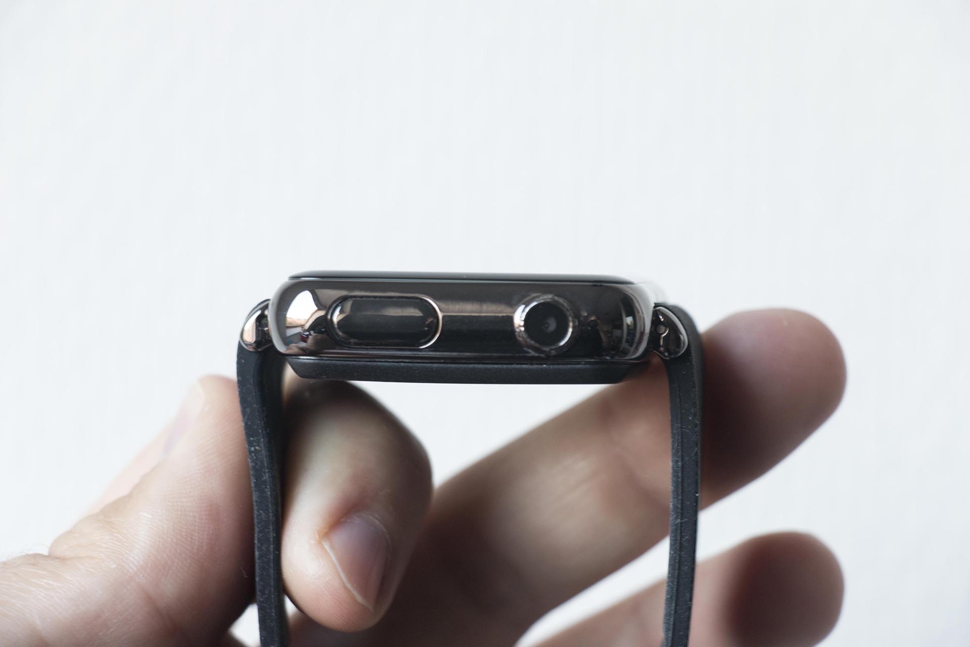 Zo is de mooie draaiknop van Apple vervangen voor een 0,3 megapixel camera met daaronder de enige echte knop van het horloge. Aan de andere kant zit een klepje met daarachter de micro-USB aansluiting en daar vinden we ook de gaatjes voor de microfoon en de speaker van het horloge.