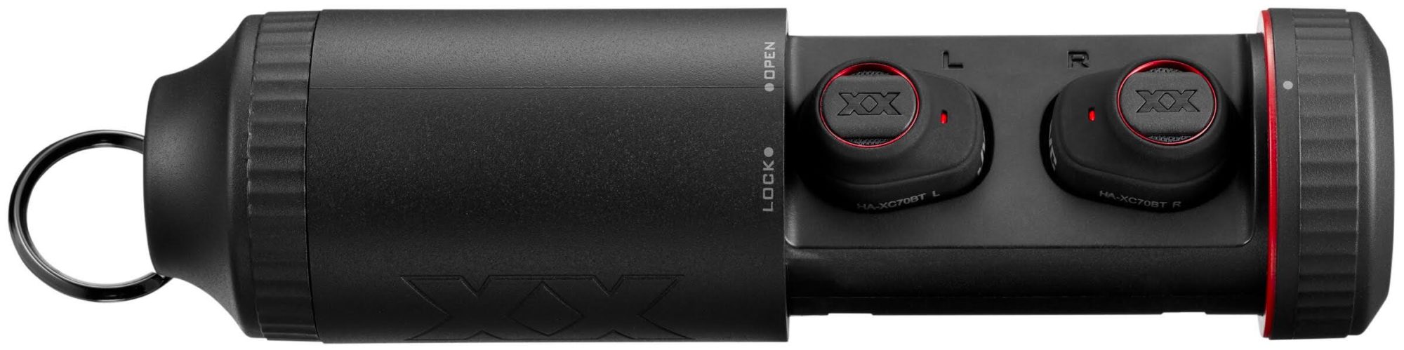 De JVC HA-XC70BT is een setje true wireless oordopjes. De oordopjes zijn voorzien van rubberen anti-schok bescherming en speciale deep bass poorten. De accu’s in de oordopjes gaan 3 uur mee en kunnen worden opgeladen in het meegeleverde doosje dat ook als powerbank wordt gebruikt. Je kunt drie keer laden vanaf de powerbank, dus maximaal 12 uur luisteren.