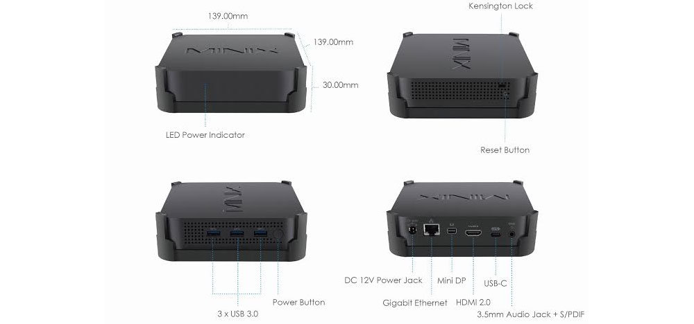 Qua aansluitingen krijg je het goed met deze nieuwe computer. Drie USB 3.0 poorten en Gigabit ethernet worden ondersteund. Minix levert ook de VESA mount mee.