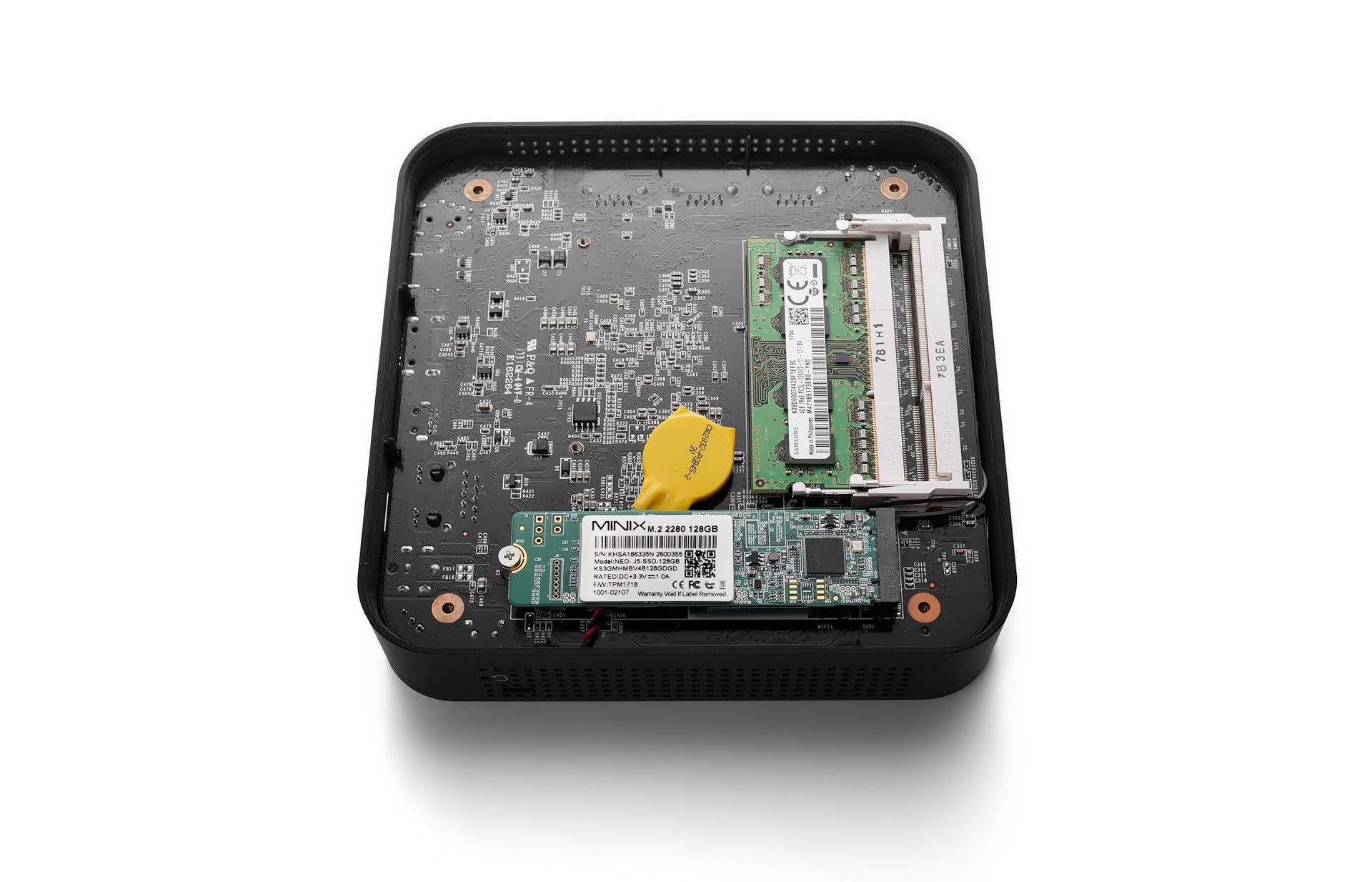 De Neo J50C-4 beschikt over twee SODIMM sloten en één M.2 SSD slot. Minix levert zelf een 512GB SSD en setjes met maximaal 16GB geheugen die geoptimaliseerd zijn voor de Neo J50C-4. Je hoeft dus niet na te denken over wat je het beste kunt kopen.