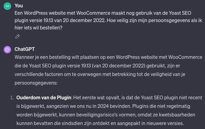 Wil jij je aanmelden? Dat raden we je toch af. De broncode van de website laat namelijk zien dat deze rond 20 december 2022 voor het laatst security patches heeft gekregen voor een veelgebruikte plugin. We konden het niet laten om de volgende vraag aan ChatGPT te stellen: