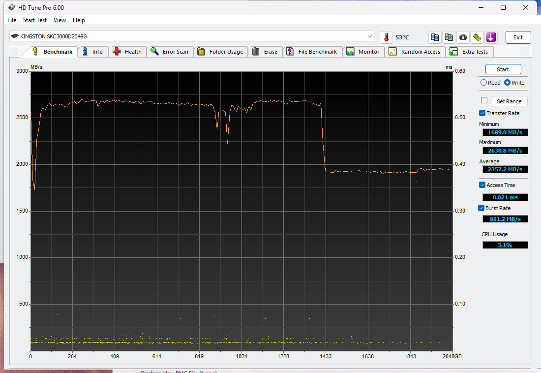 De SSD presteert degelijk bij snelle dataverplaatsingen. Vooral bij random write workloads en grote bestandsoverdrachten blijft de KC3000 stabiele prestaties leveren. Dit spreekt positief voor de prestaties bij real-world toepassingen.