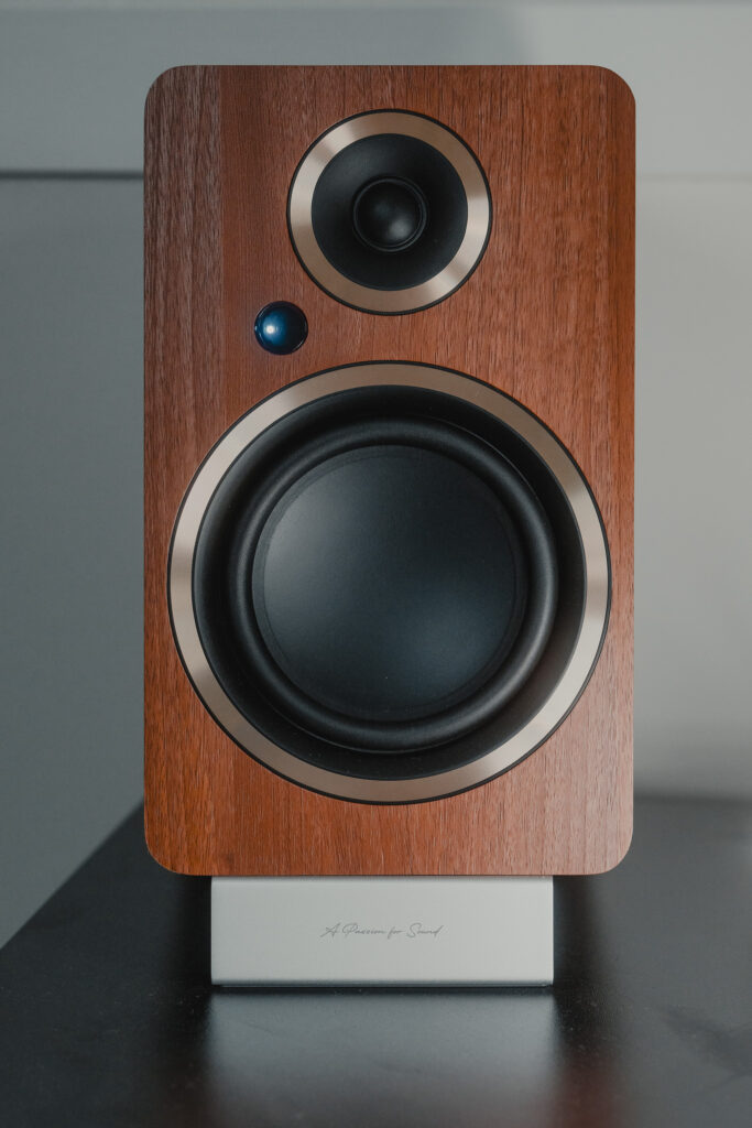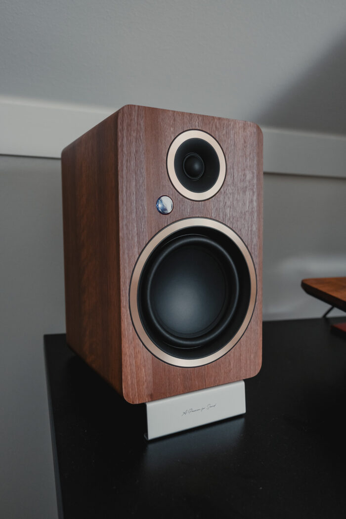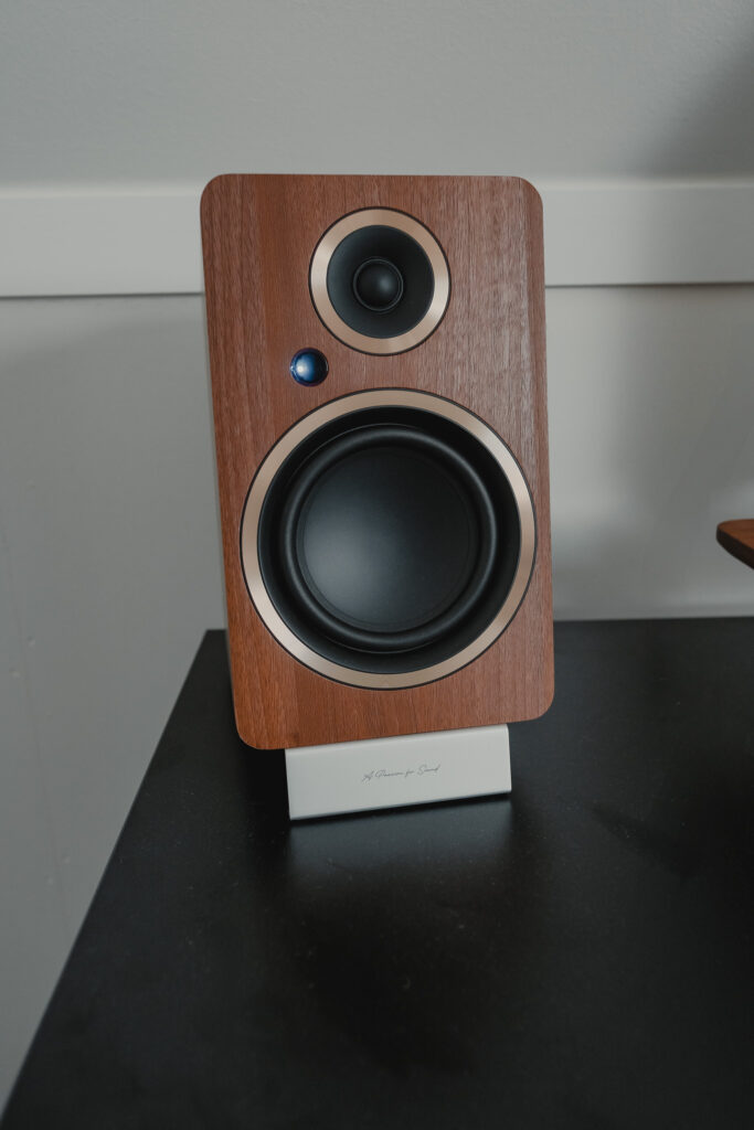 Zelden heb ik zulke stijlvolle speakers op mijn bureau gehad. De Argon Fenris A5 ziet er strak en verfijnd uit, met een walnootkleurige afwerking die warmte toevoegt aan elk interieur. De goud-koperachtige ringen rond de drivers geven het geheel een luxe uitstraling zonder opzichtig te zijn.
