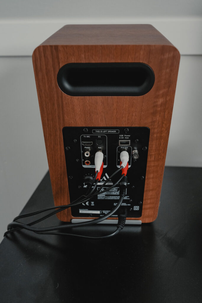 De volumeknop zit aan de achterkant van de master speaker, maar die gebruik ik zelf niet omdat ik het volume regel via mijn Mac Mini. Voor wie via Bluetooth luistert of bijvoorbeeld een platenspeler aansluit, is deze knop wel handig.