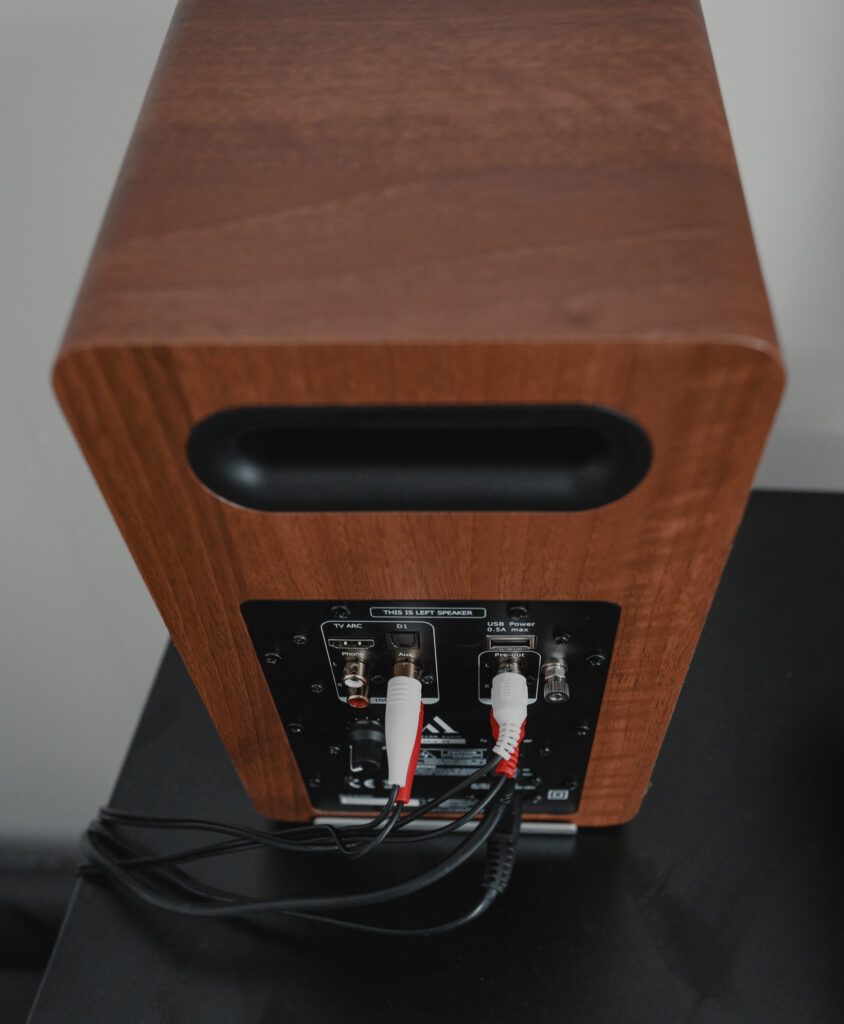 De aansluitpunten zijn verguld voor optimale signaaloverdracht, en er is zelfs een dimbare LED aanwezig voor de statusindicator. Voor mijn gebruik – voornamelijk via optical in op mijn Mac Mini – is dit meer dan voldoende. Dat er maar één speaker een stroomkabel nodig heeft, vind ik trouwens ook echt slim bedacht. Dat scheelt gewoon weer kabels op je bureau. Ik gebruik zelf de analoge RCA-aansluiting in combinatie met een headphone jack op mijn Mac Mini. Dat werkt voor mij het makkelijkst en het geluid is top. Fijn ook dat er maar één speaker een stroomkabel nodig heeft – dat scheelt gedoe met kabels.