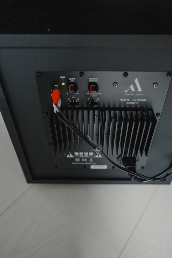 De Malmö Sub 10 voegt een flinke portie bas toe. Deze 10-inch subwoofer levert 100 watt RMS (met pieken tot 200 watt), wat meer dan genoeg is voor kleine tot middelgrote ruimtes. Het is een long-stroke woofer, wat betekent dat hij flink kan bewegen en daardoor diepe bastonen produceert zonder vervorming. Het frequentiebereik loopt van 37 tot 180 Hz, en je kunt zelf de crossover frequentie instellen tussen 35 en 120 Hz – handig om het geluid goed af te stemmen op je ruimte en de rest van je set-up. Je sluit ‘m aan via RCA en er zit een volumeknop op de achterkant om de bass precies goed af te stellen. Ook schakelt hij automatisch aan en uit, wat fijn is in dagelijks gebruik.