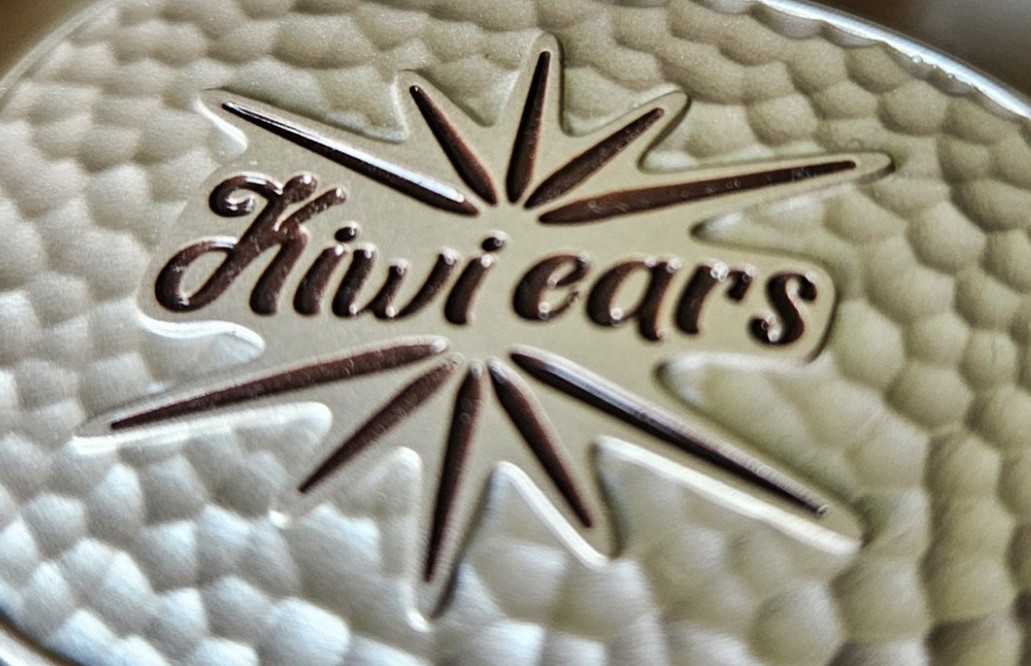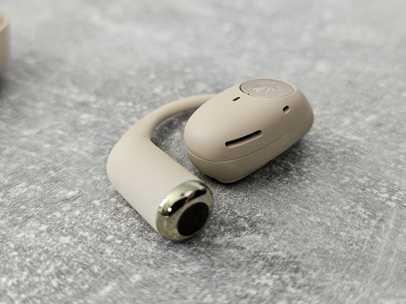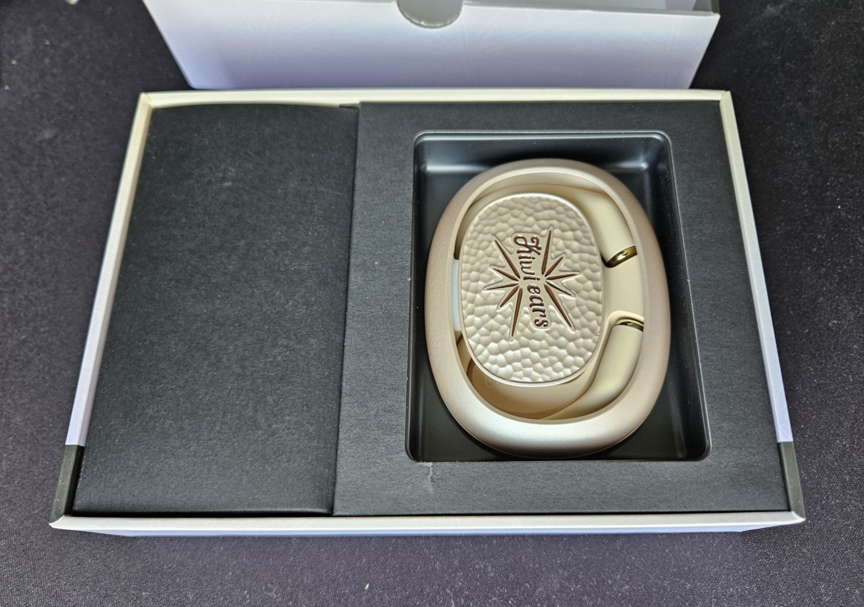 De headset is grotendeels bedekt met mat lichtbruin siliconenmateriaal, wat zich uit in een zachte, huidvriendelijke afwerking. De buitenkant van het luidsprekerdeel bevat een metalen plaatje met het Kiwi Ears-logo, een aanraakgevoelig oppervlak en een LED. De binnenkant heeft een rechthoekige metalen rooster met afgeronde hoeken die de luidsprekeropening beschermt.