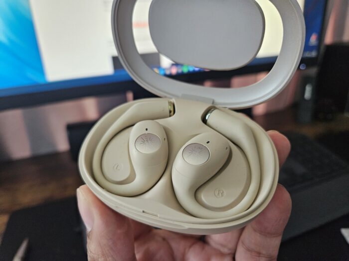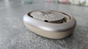 Het midden van het deksel heeft een soort ‘zwevend’ design meegekregen. Derest van de case is afgewerkt met dezelfde matte siliconen textuur als de oordoppen wat het geheel een premium feel geeft. De USB-C poort bevindt zich aan de achterkant, en de voorzijde bevat een multikleurige LED-indicator die het opladen en de laadcapaciteit van de case (constant branden) of headset (knipperent) aangeeft met een rode, groene en blauwe kleur voor een laadvordering van resp. 1-13%, 31-70% en 71-100%. Wanneer je niet bekend bent met de headset kan dit een beetje een rare ervaring geven, omdat het net lijkt alsof de headset in pairingmodus staat of een foutmeling aangeeft, terwijl deze dus gewoon de headset aan het opladen is.