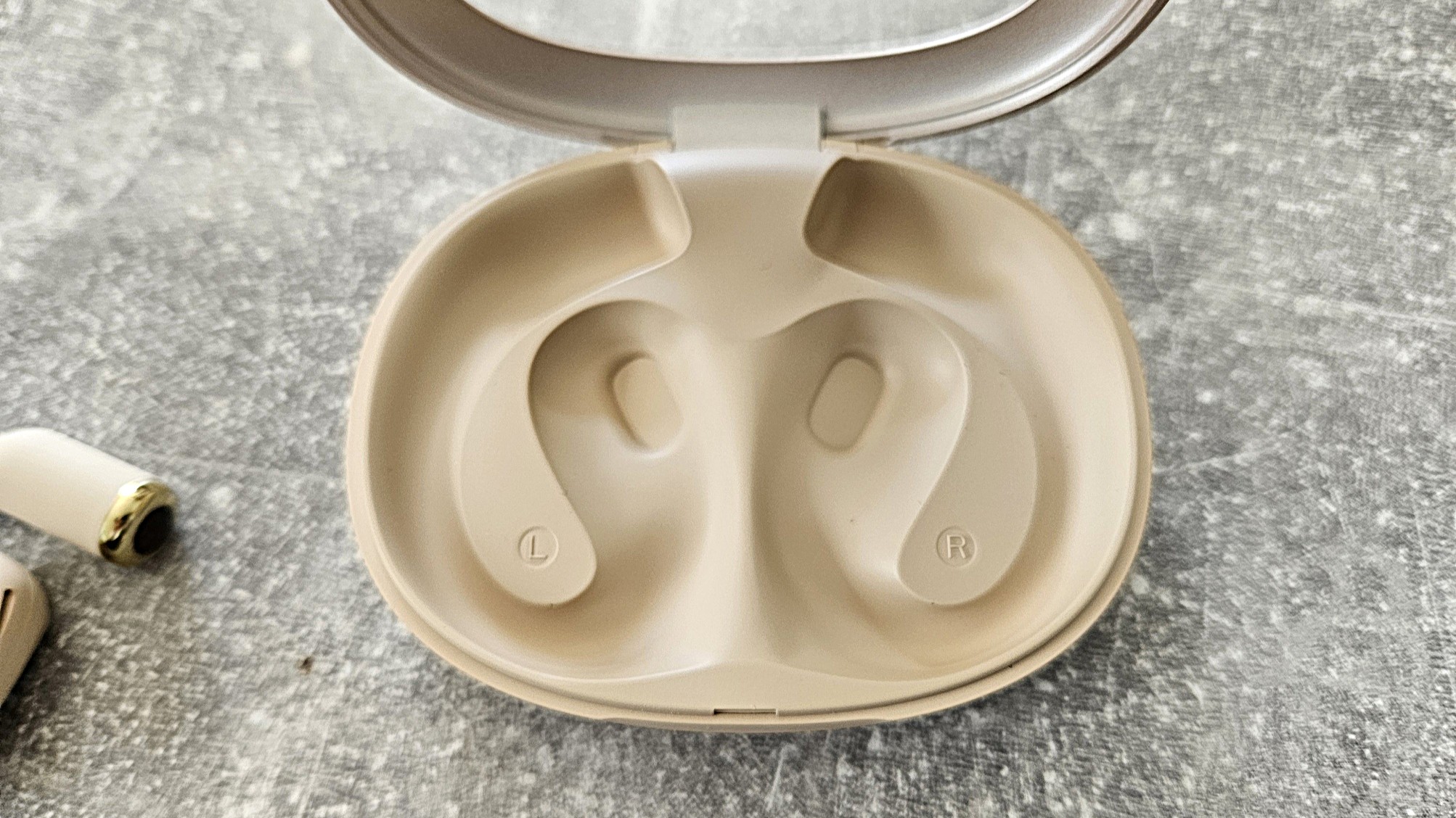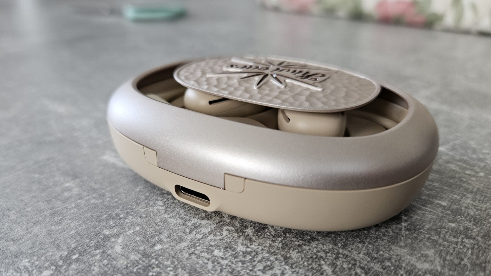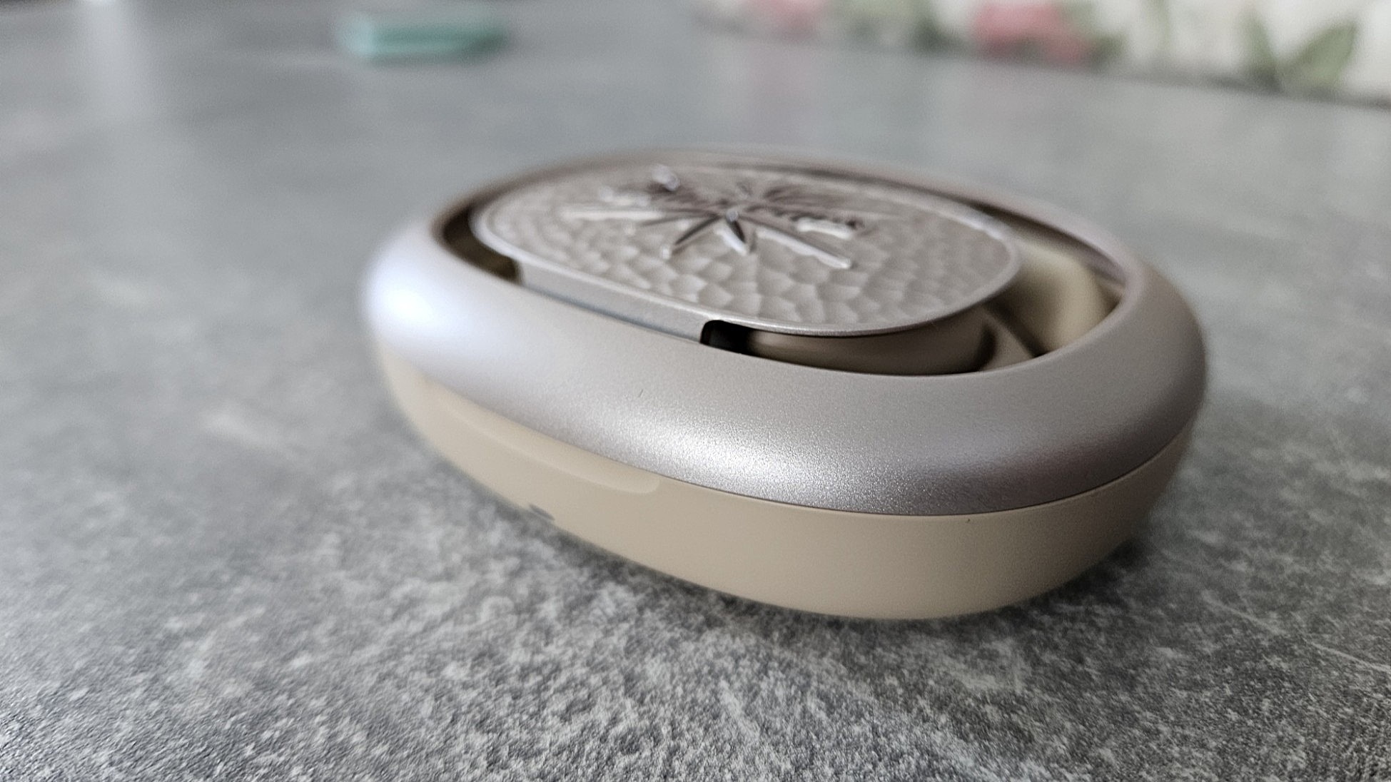 De oplaadcase heeft een zeer eigenzinnig design meegekregen. Het deksel is van metaal in champagnekleur en is deels open, waardoor de headset deels zichtbaar blijft wanneer de case gesloten is.