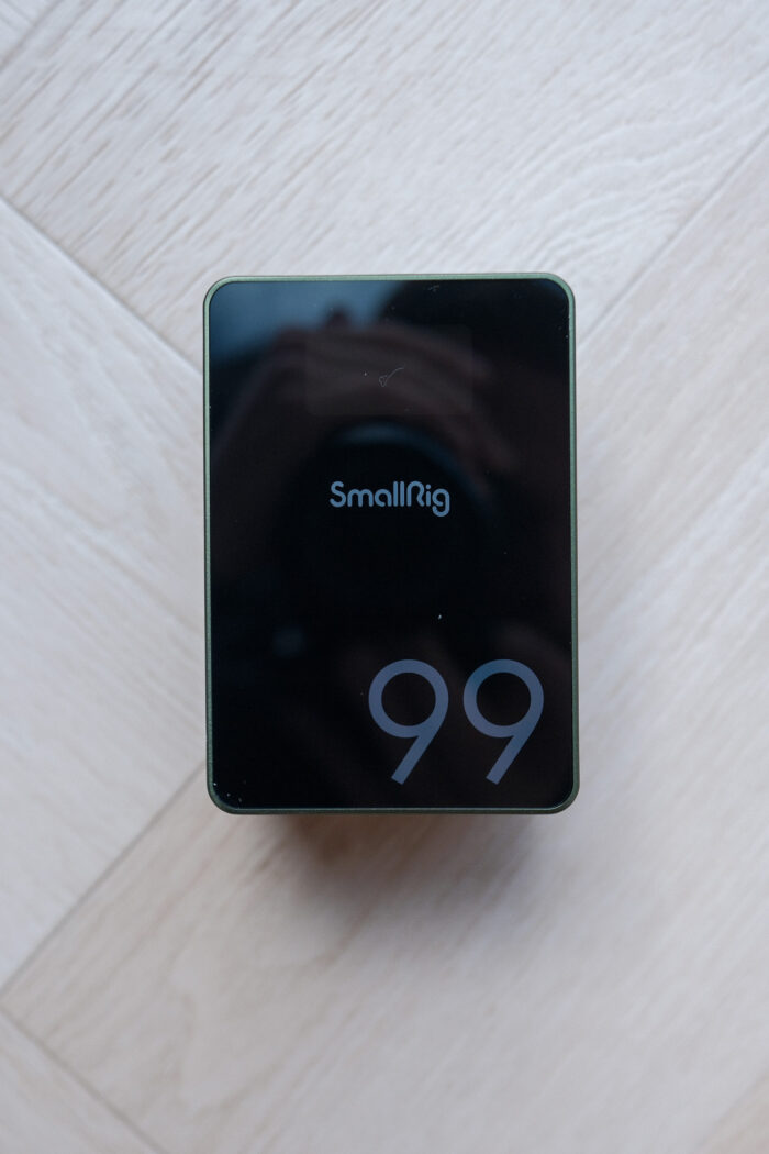 Wat direct opvalt is hoe klein deze batterij eigenlijk is. Met een formaat van 107,2 x 73,2 x 55,2 mm en een gewicht van slechts ongeveer 660 gram, is hij beduidend kleiner dan traditionele V-Mount batterijen met vergelijkbare capaciteit. SmallRig claimt dat deze batterij tot 70% kleiner is dan een standaardmodel – en dat lijkt te kloppen.