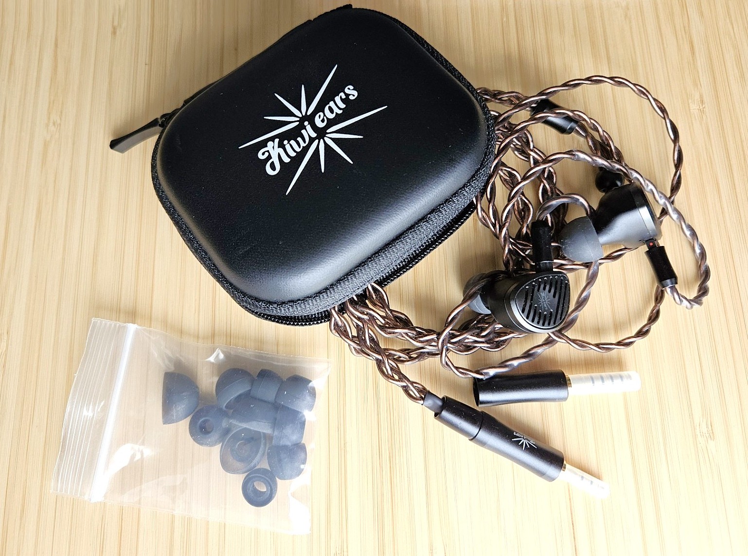 De Kiwi Ears Septet wordt geleverd in een relatief bescheiden verpakking. Op zich prima, aangezien je je dan niet verplicht voelt de doos te houden. Daarnaast kan gesteld worden dat alle ontwikkelingskosten zo veel mogelijk naar de in-ears gegaan is. In de doos vinden we de IEM’s, een modulaire kabel met een 2-pin aansluiting, zes sets eargels en een draagbare harde case.