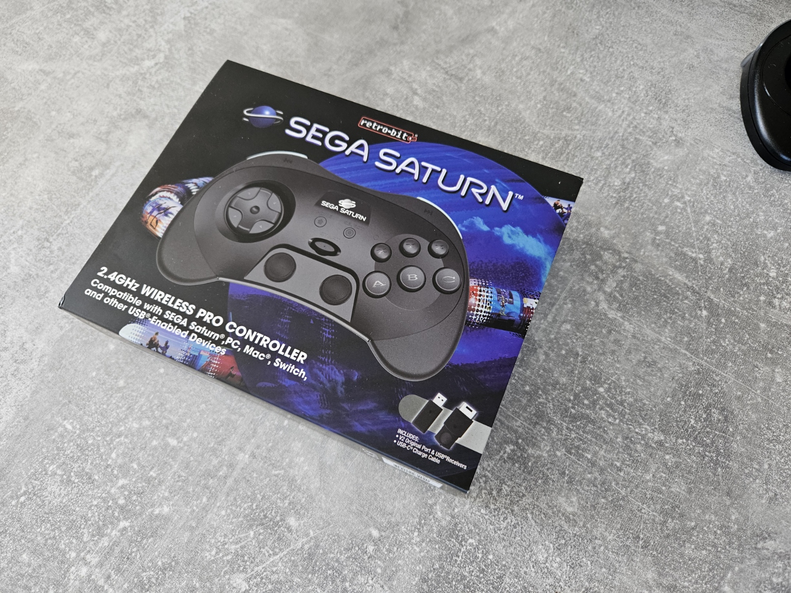 Hoe dan ook, op het eerste gezicht voelen we amper een verschil. De Retro-Bit-controller is iets zwaarder en dikker, waarschijnlijk door de batterij en extra knoppen. Maar apart daarvan is het grotendeels gewoon de Saturn Model 2-controller met twee analoge sticks (voor de mensen die het niet weten; de Saturn had al een 3D-controller (waar de huidige Xbox-controllers eigenlijk een doorontwikkeling van zijn) en deze was bruikbaar voor o.a. Nights Into Dreams en Panzer Dragoon Saga) en een extra set schouderknoppen.