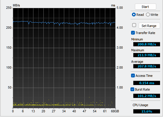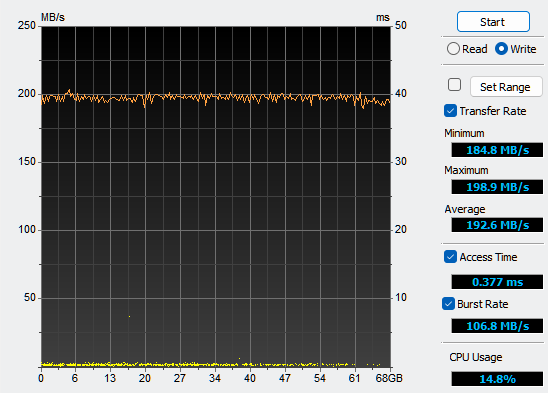 HDTune meet sequentiële leesprestaties over de hele schijf en geeft een gemiddelde snelheid weer. Anders dan Crystal Disk Mark dat synthetische benchmarks uitvoert met korte bursts van gegevens gebruikt HDTune een langzame, constante benadering waarbij de snelheid over de hele opslag wordt gemeten.