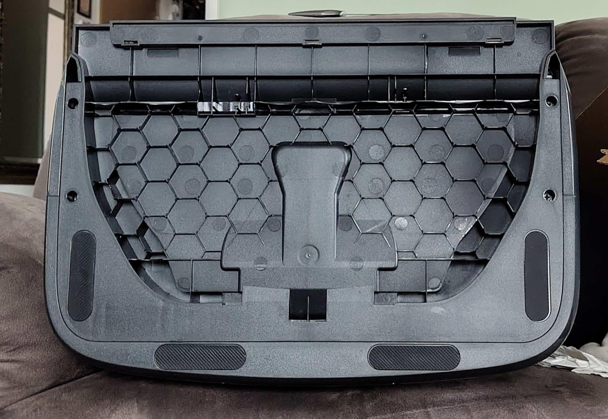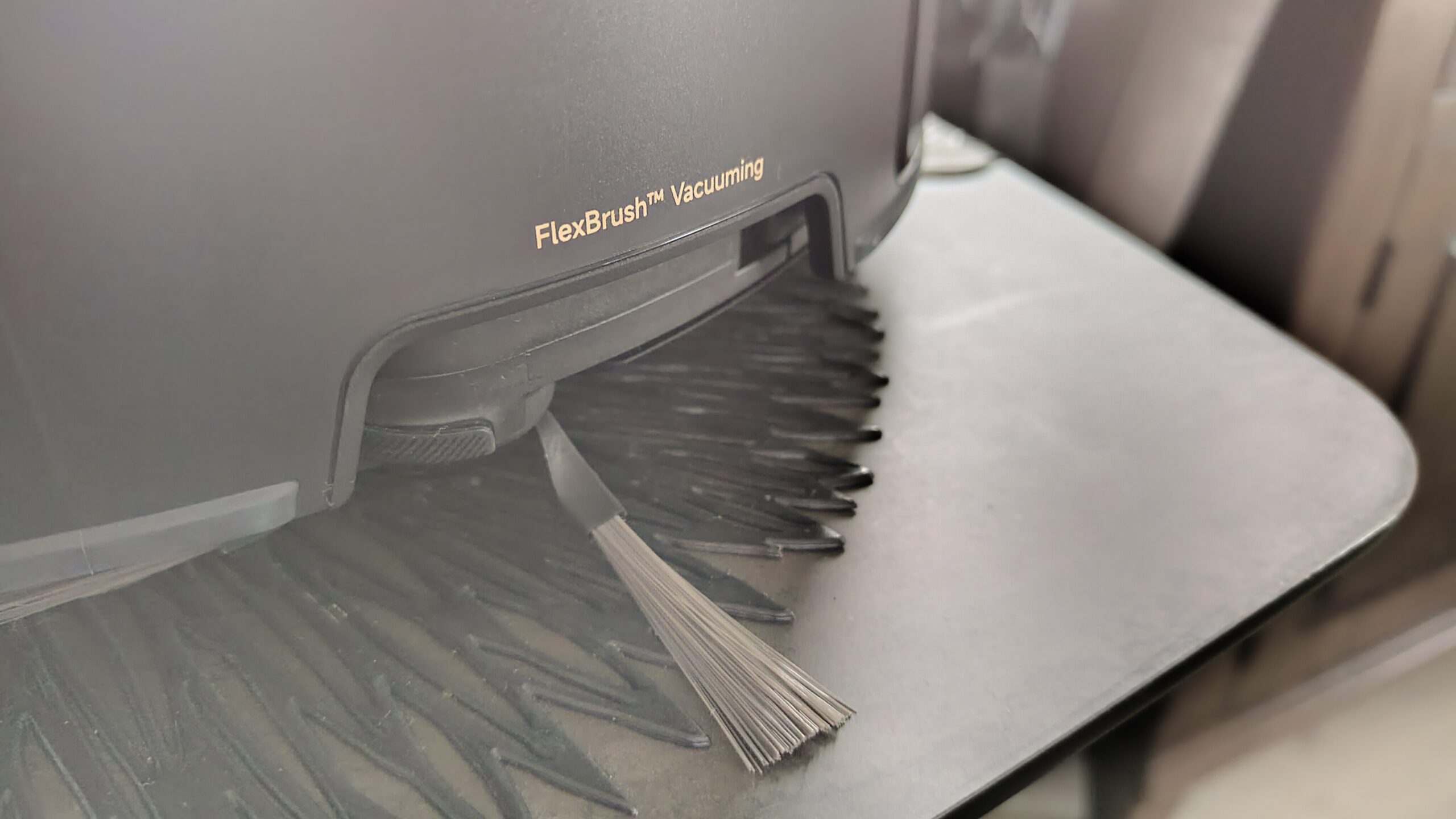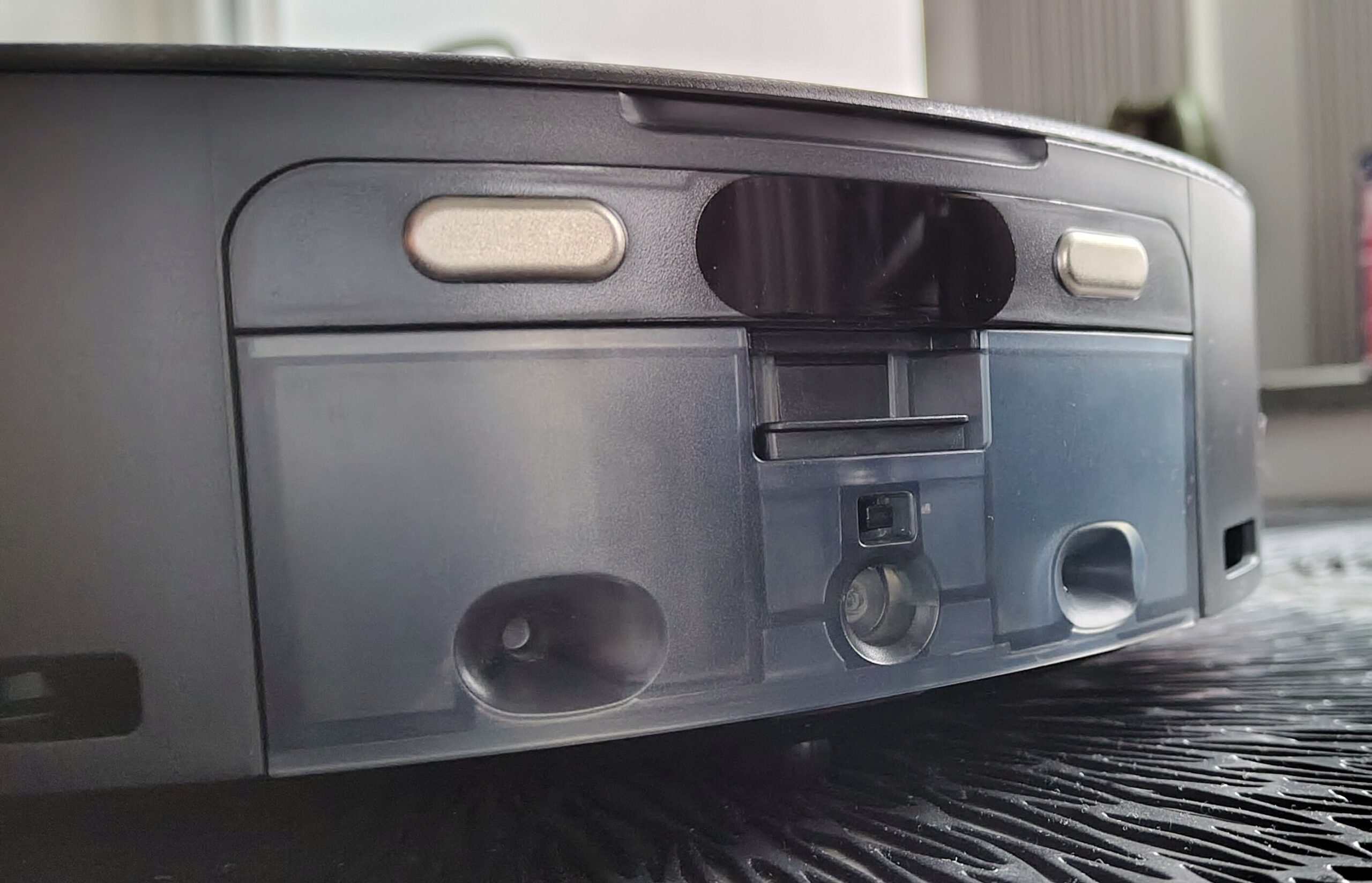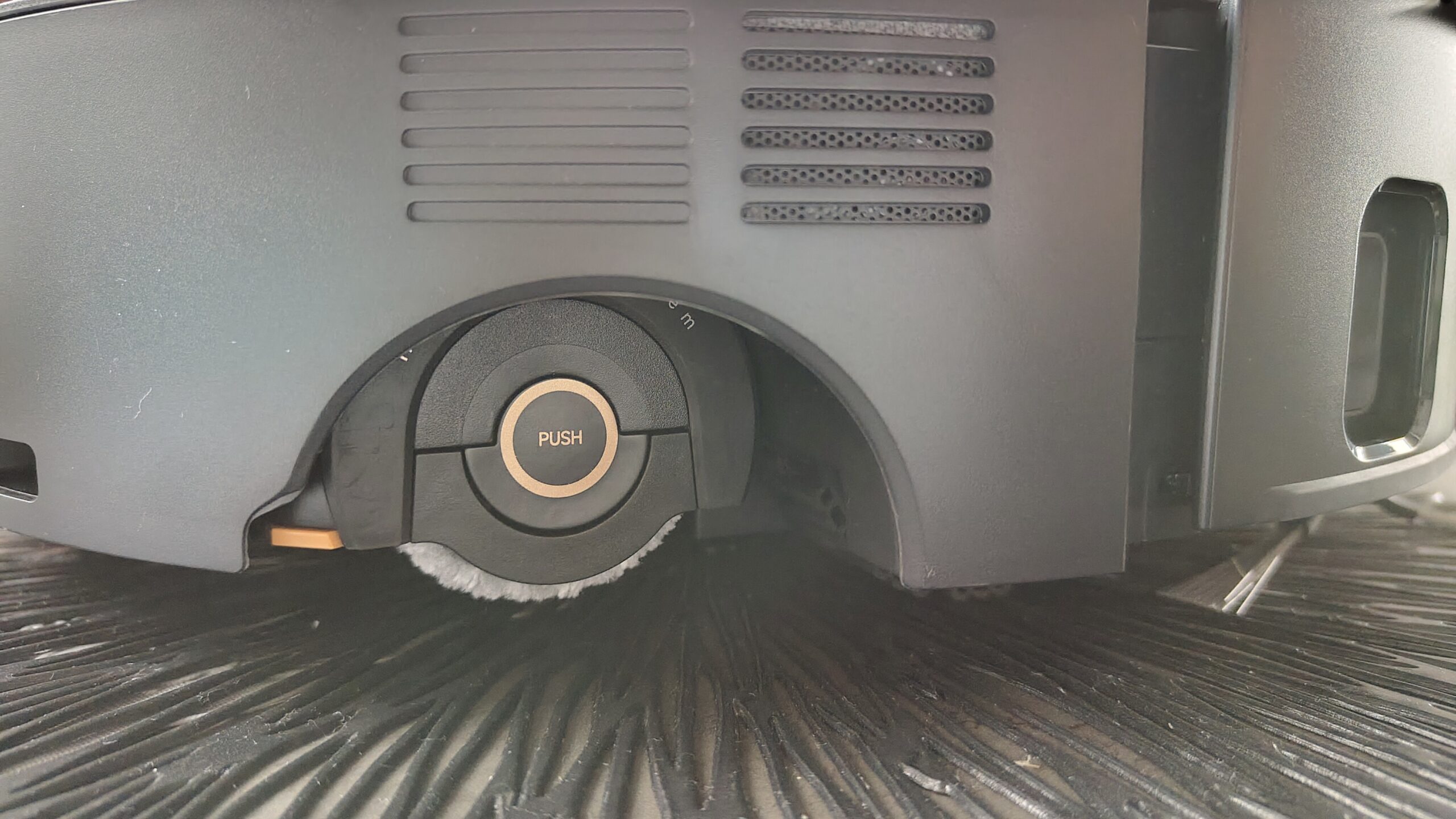 Aan de onderzijde zien we de wielen met een diep profiel. Verder o.a. de borstel voor het dweilen, de tapijtsensor en de afgrondsensoren. Het zwenkwiel komt opvallend simpel over. We hebben ook het idee dat we het wiel duidelijk horen op onze laminaatvloer wanneer de stofzuiger een bocht maakt en we het zelfs horen ratelen (tenminste, we denken dat het het zwenkwiel is):