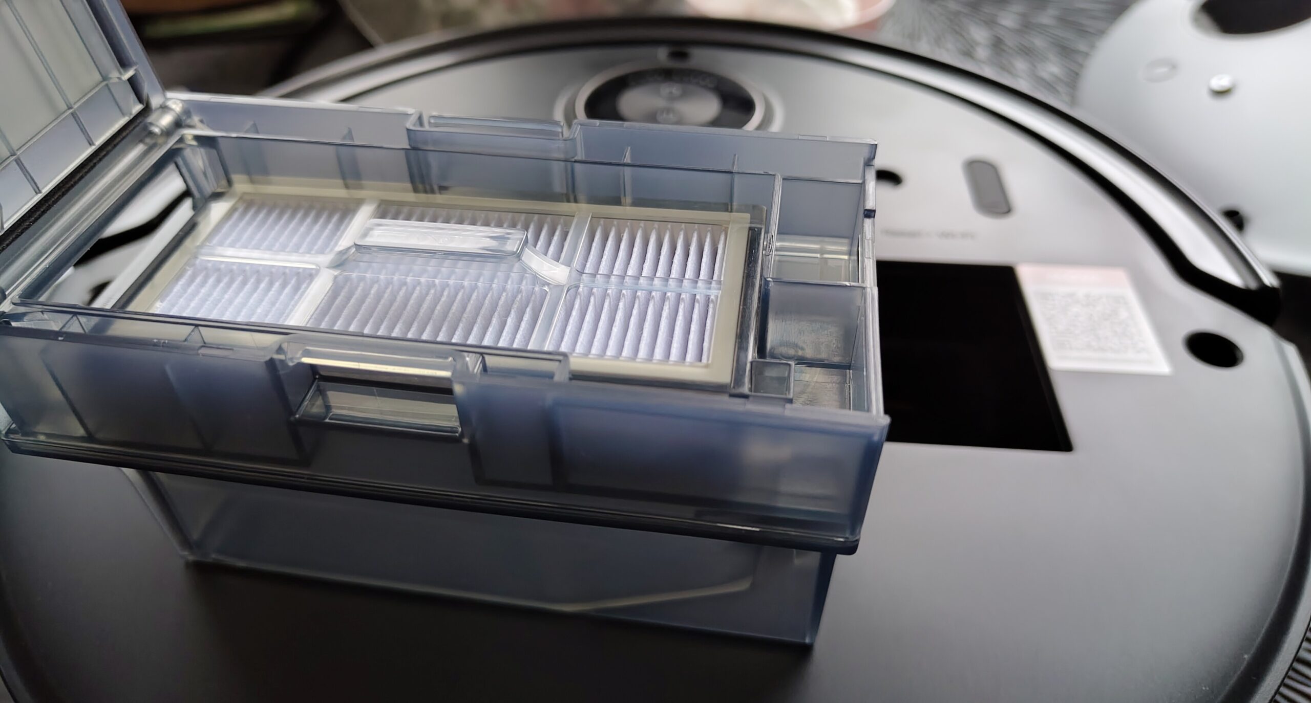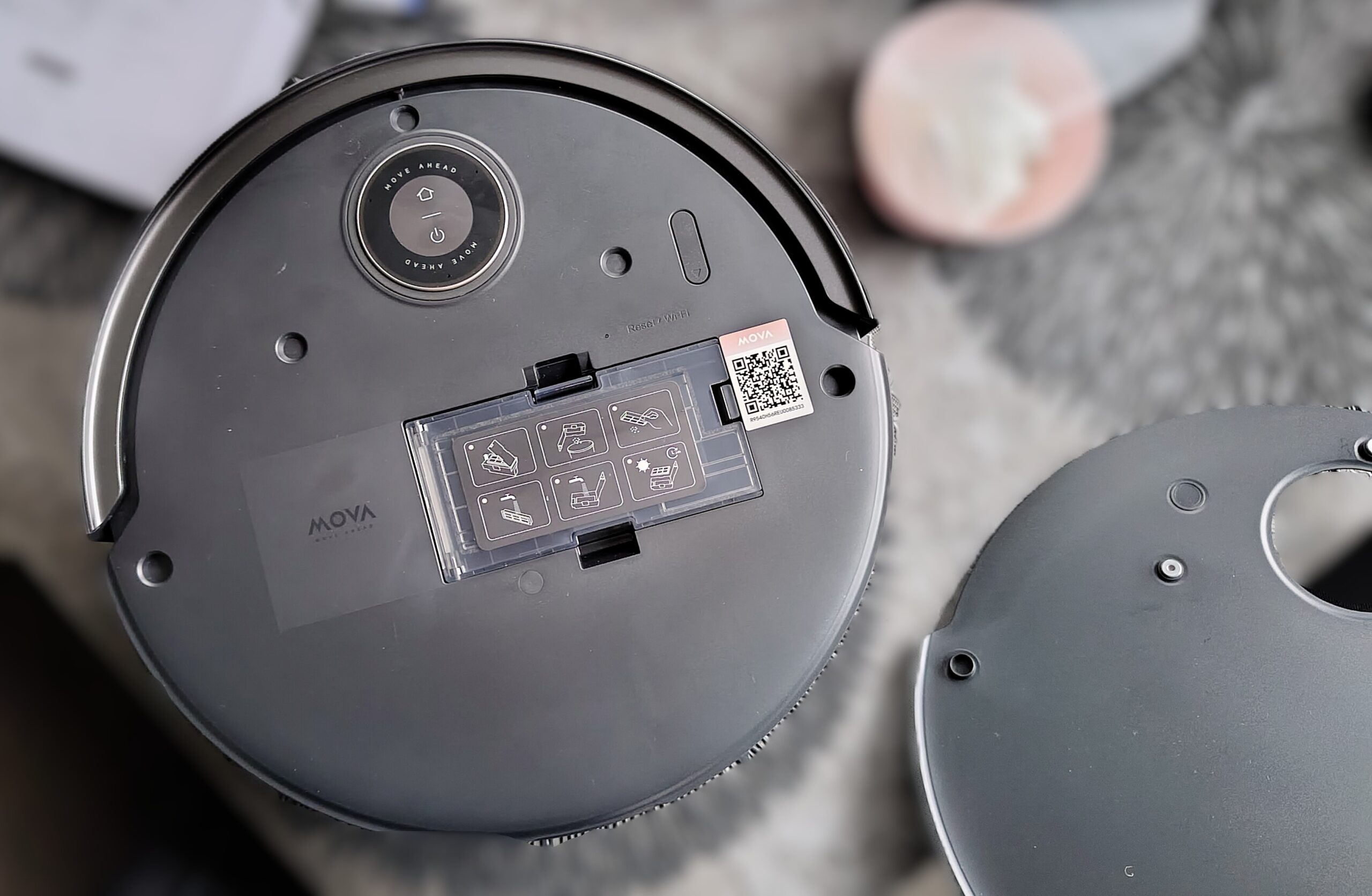 Onder de bovenklep van de stofzuiger vinden we het stofreservoir, een resetknop en de QR-code voor het pairen.