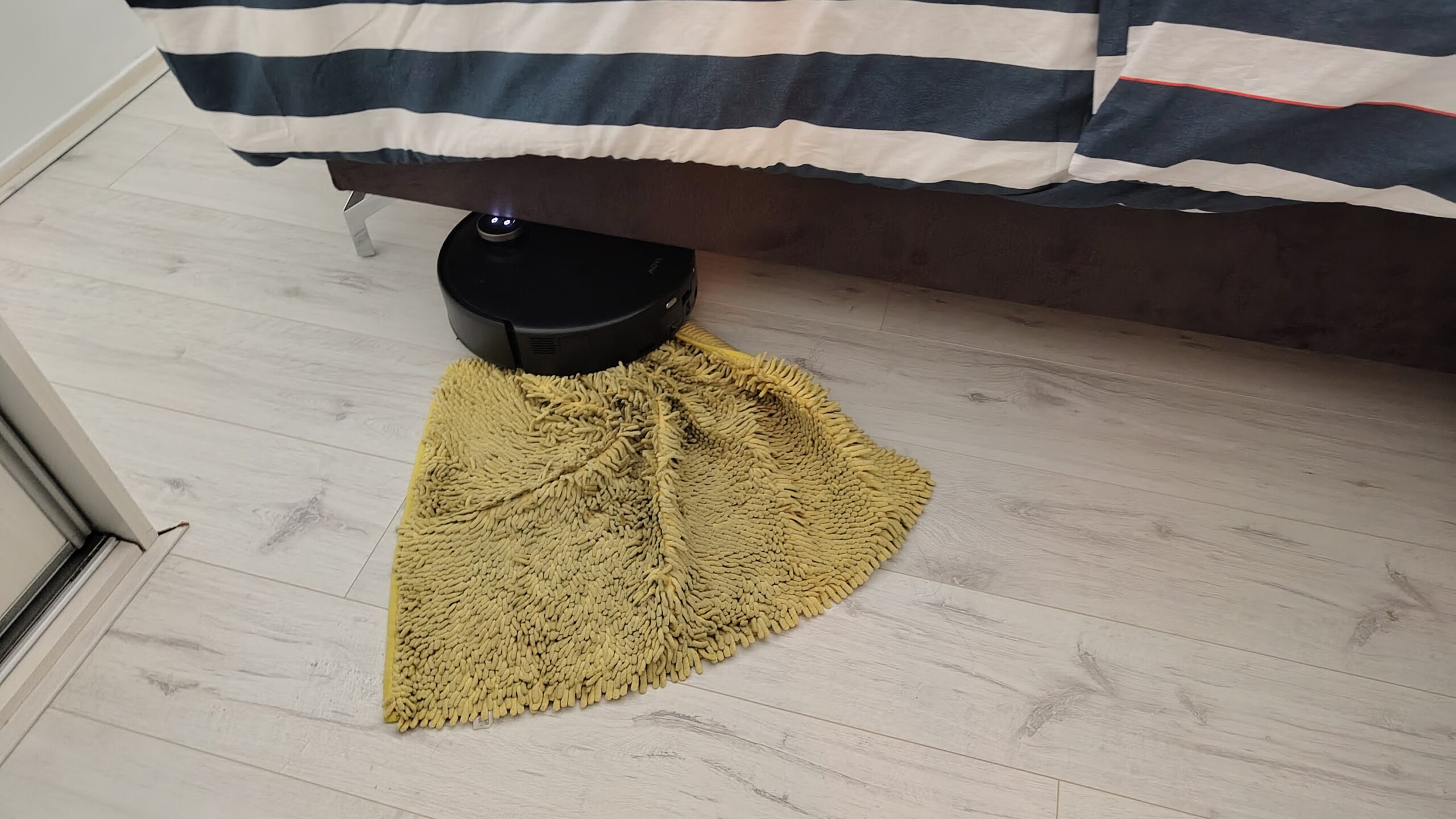 De zuigkracht wordt verhoogd zodra tapijt wordt gedetecteerd. In combinatie met de AutoShield-functie, die de mop optilt en een vochtbarrière plaatst, blijven tapijten schoon én droog. Maar we moeten zeggen dat we met de V50 totaal geen last hadden van een nat tapijt, dus hoeveel meerwaarde deze functie heeft? Misschien voor hoogpolige tapijten? Verder maakten we een enkele keer mee dat een vloermat bleef hangen en van zijn plek getrokken werd en een licht tapijt niet herkend werd als iets dat niet gereinigd kon worden (en dus als obstakel aangemerkt had moeten worden):