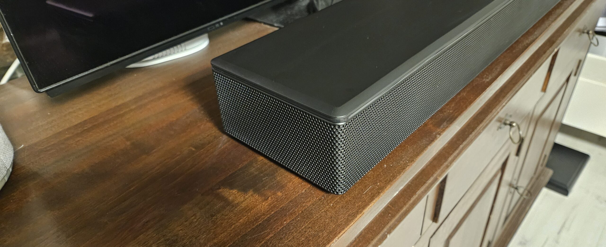 De gekozen hoek is wat overdreven, maar het is duidelijk wat we bedoelen. Dit gezegd hebbende hebben we tijdens het kijken op de afstand waar de bank staat, eigenlijk nooit echt in de ervaring gemerkt dat de soundbar in beeld staat. Dit neemt niet weg dat ideaal anders is, en idealiter je een toestel hebt dat óf op een vrij hoge standaard staat, óf opgehangen is.