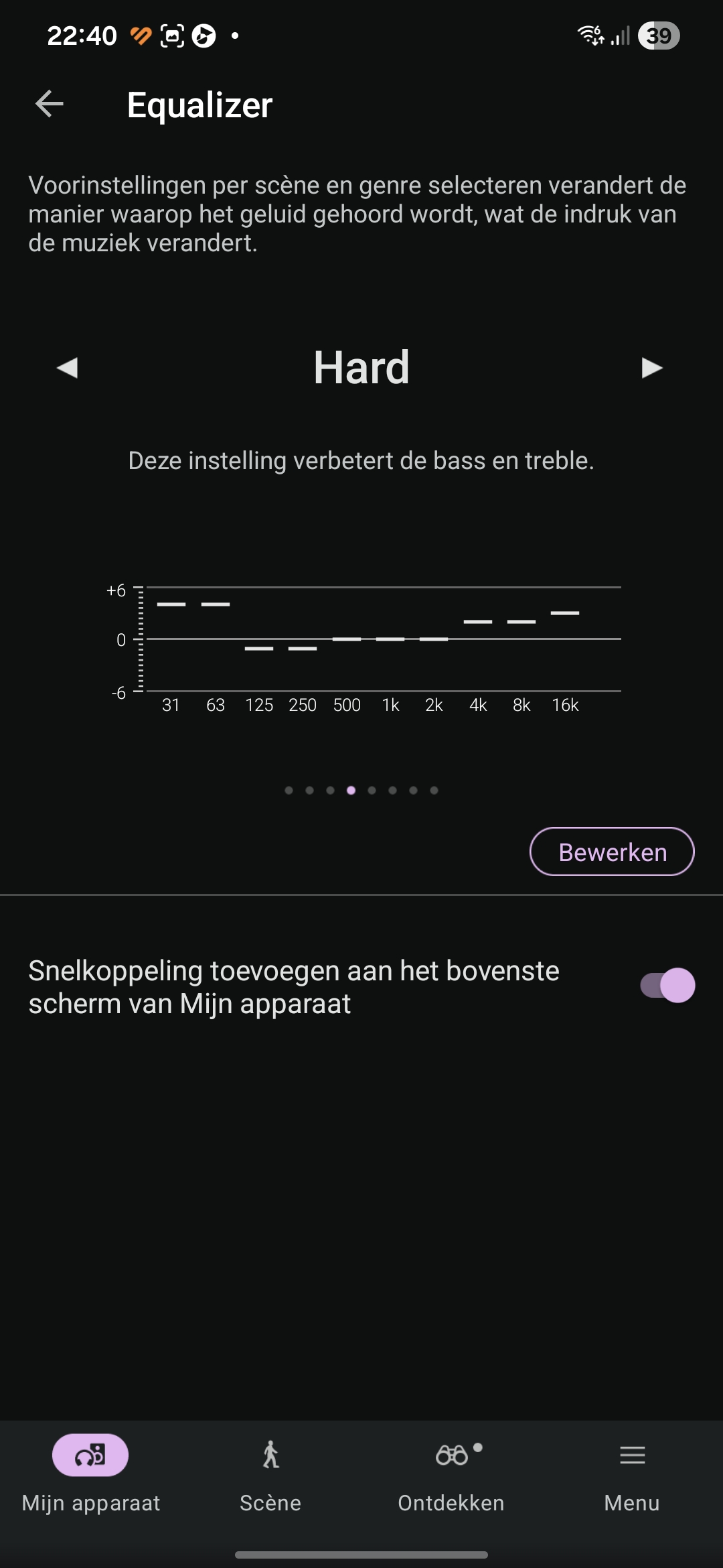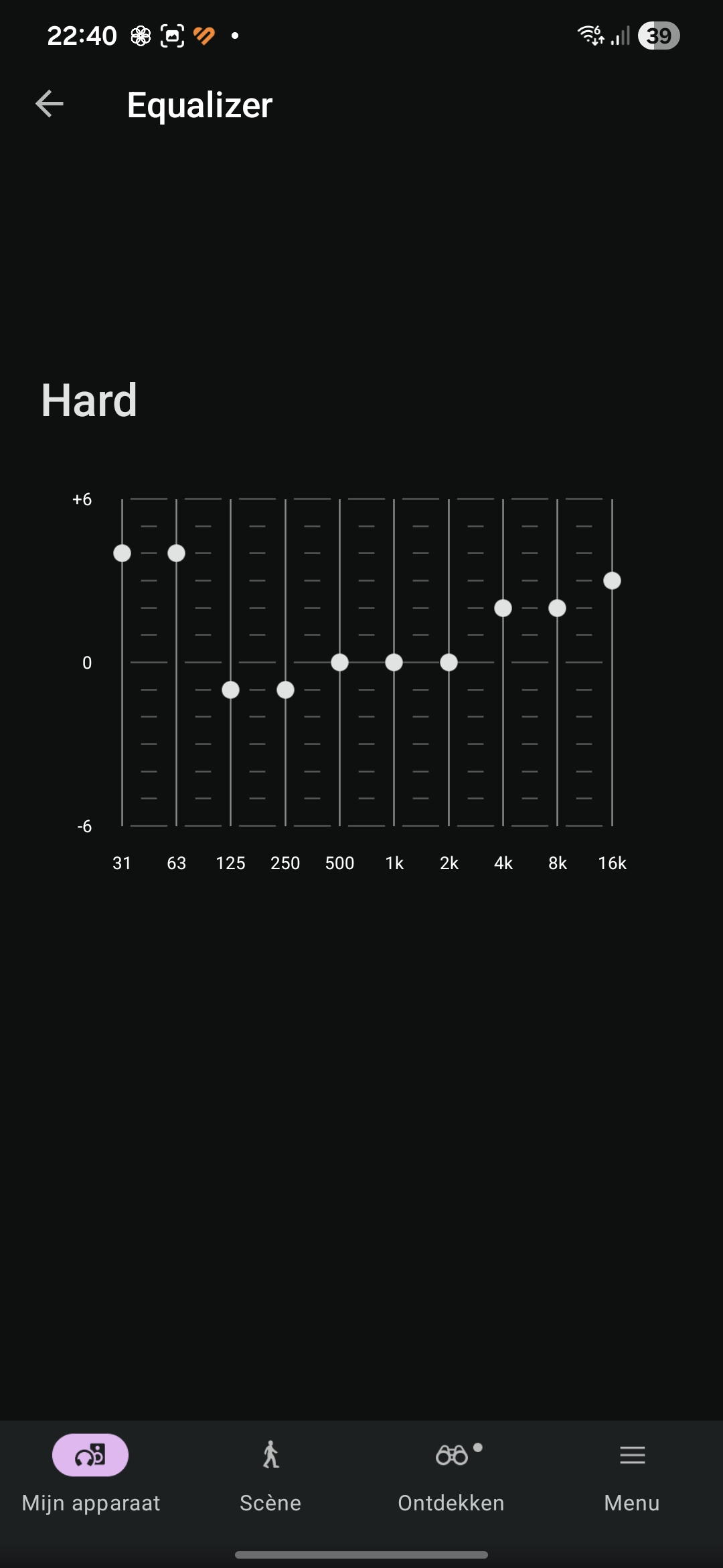 Wat we missen is een optie om het geluid op de oren van de gebruiker aan te passen op basis van het gehoor en/of voorkeur qua tonaliteit.